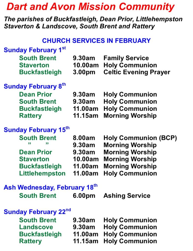 2nd, 3rd and 4th Sunday mornings in St Luke’s, Buckfastleigh, with a monthly afternoon or evening service of Celtic style worship on the 1st.